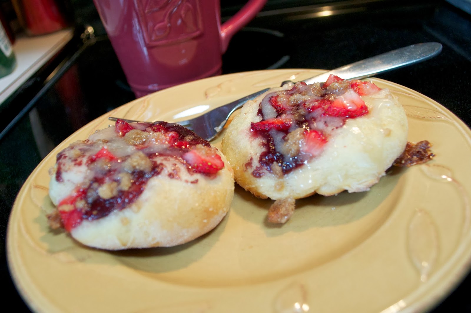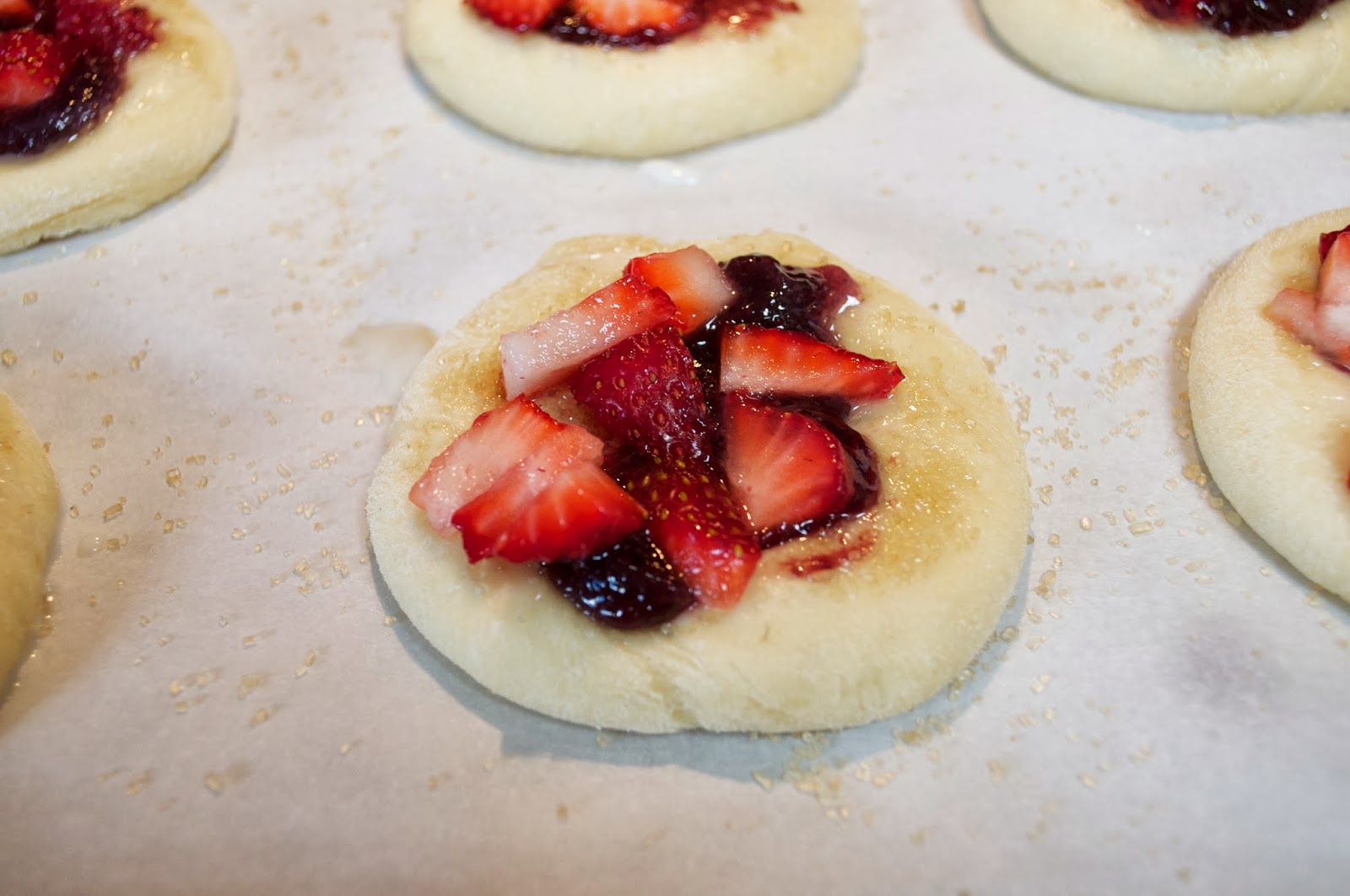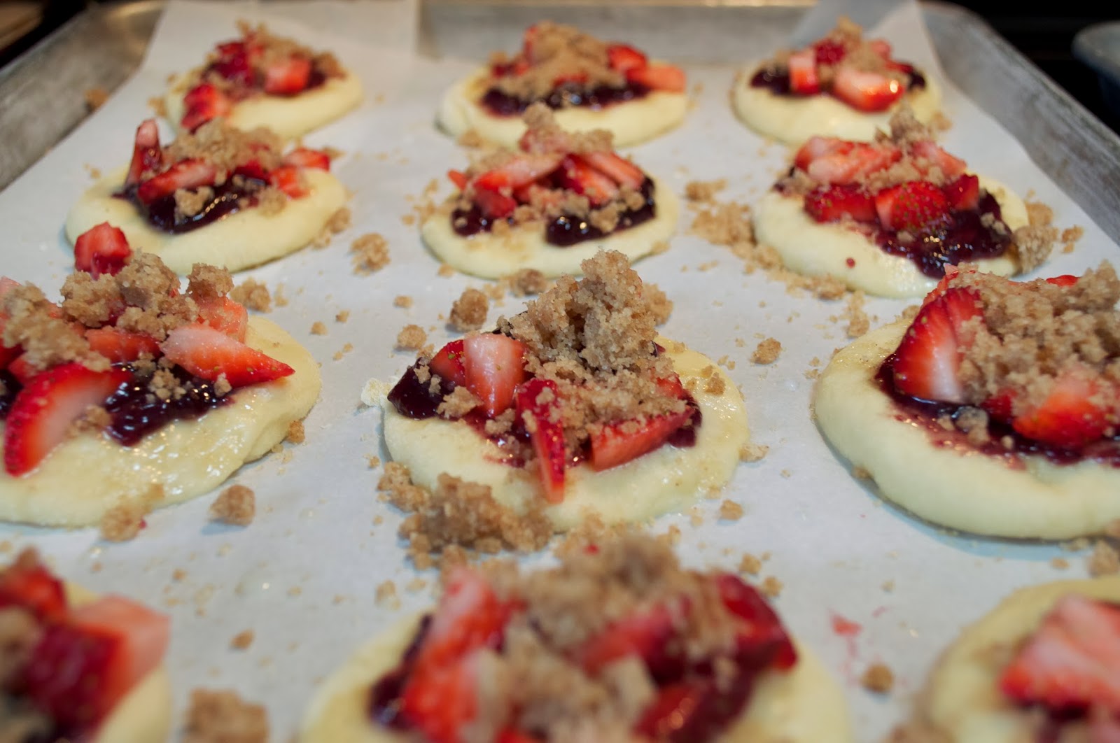Once dough has doubled in size, flatten each ball and wash with milk. Sprinkle with Sugar in the Raw (it’s a chunkier sugar with larger sugar crystals). Spread small amount of jam over the flattened dough. Place diced fruit pieces onto and then sprinkle with streusel.