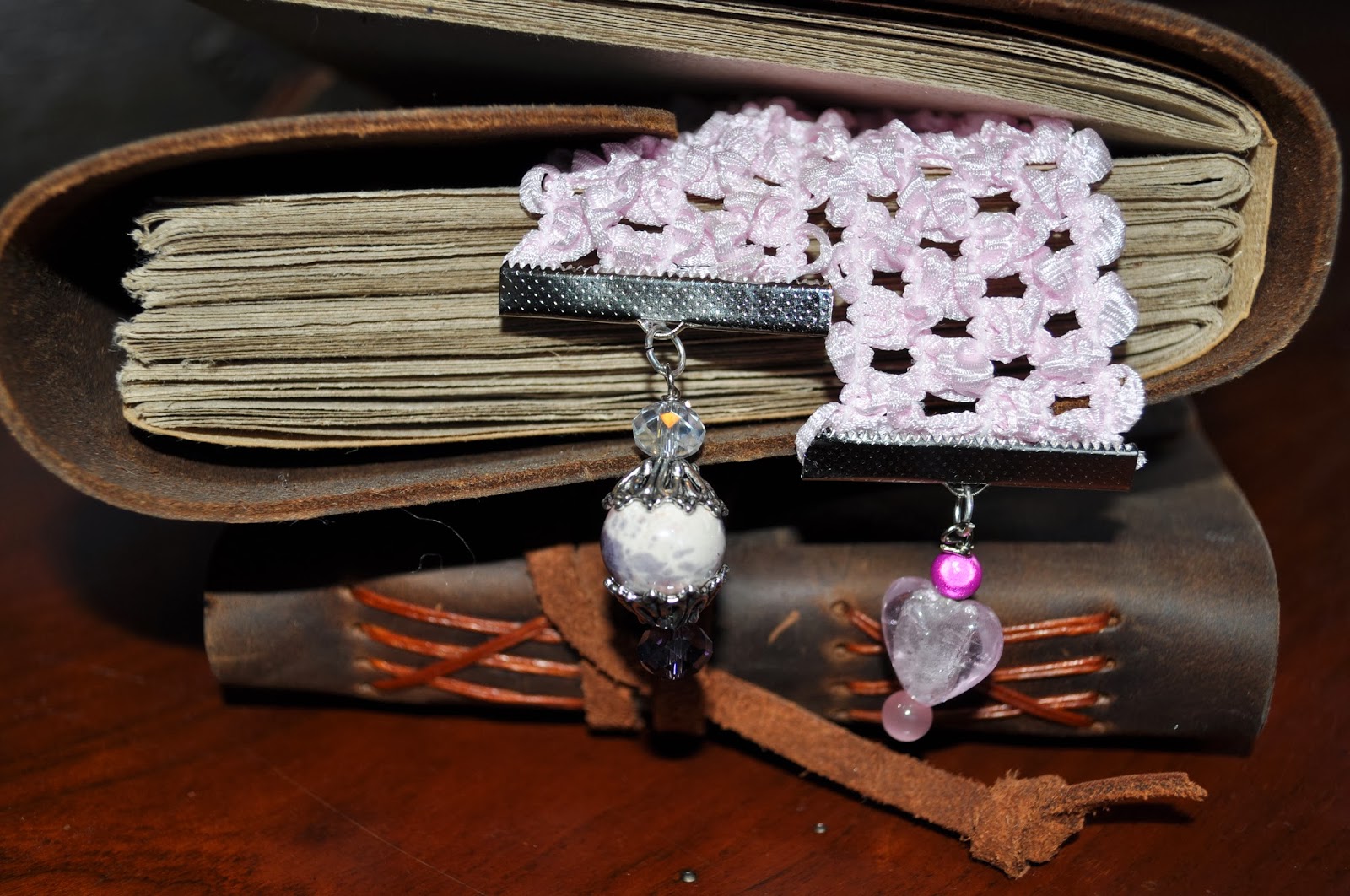After assembling the bookmarks by attaching the ribbon clamps, I then used my jewelry making supplies and created some unique charms to attach to the ends. Now, if you don’t make jewelry or even have the slightest idea of what I’m talking about, you can go to stores like JoAnn’s or Hobby Lobby and pick up pre-made charms to attach to your bookmarks. The only supply you’d need with them would be “jump rings” to attach the charm to the ribbon clamp hoop.